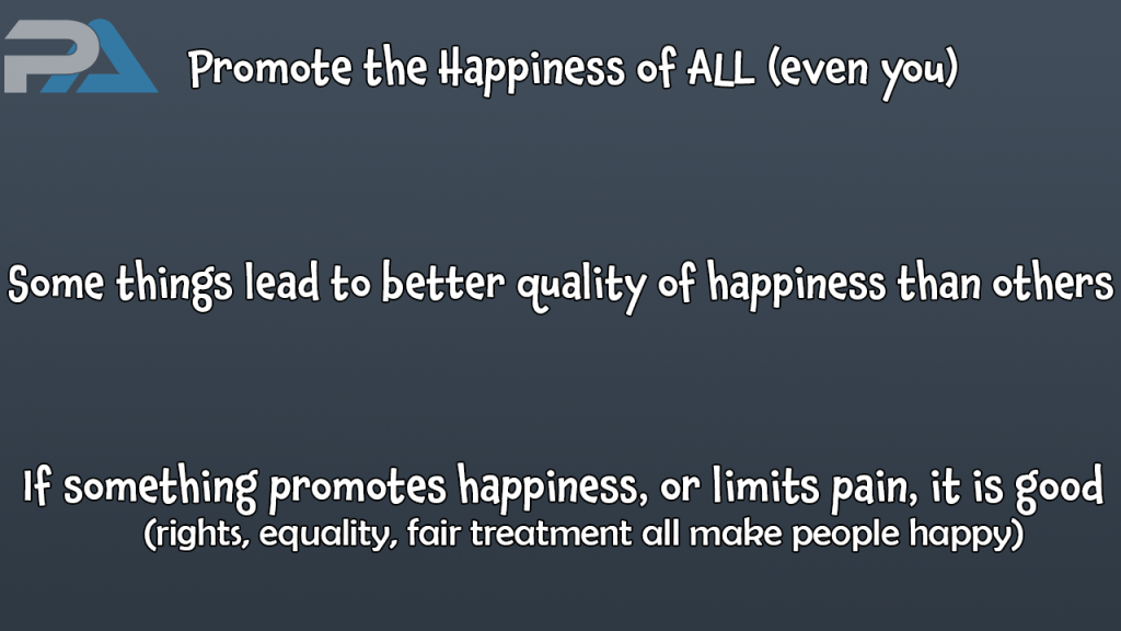 Pretty simple. The only thing to remember here is that all happiness is treated equally. We can’t act to only produce our own happiness, that would be very immoral.